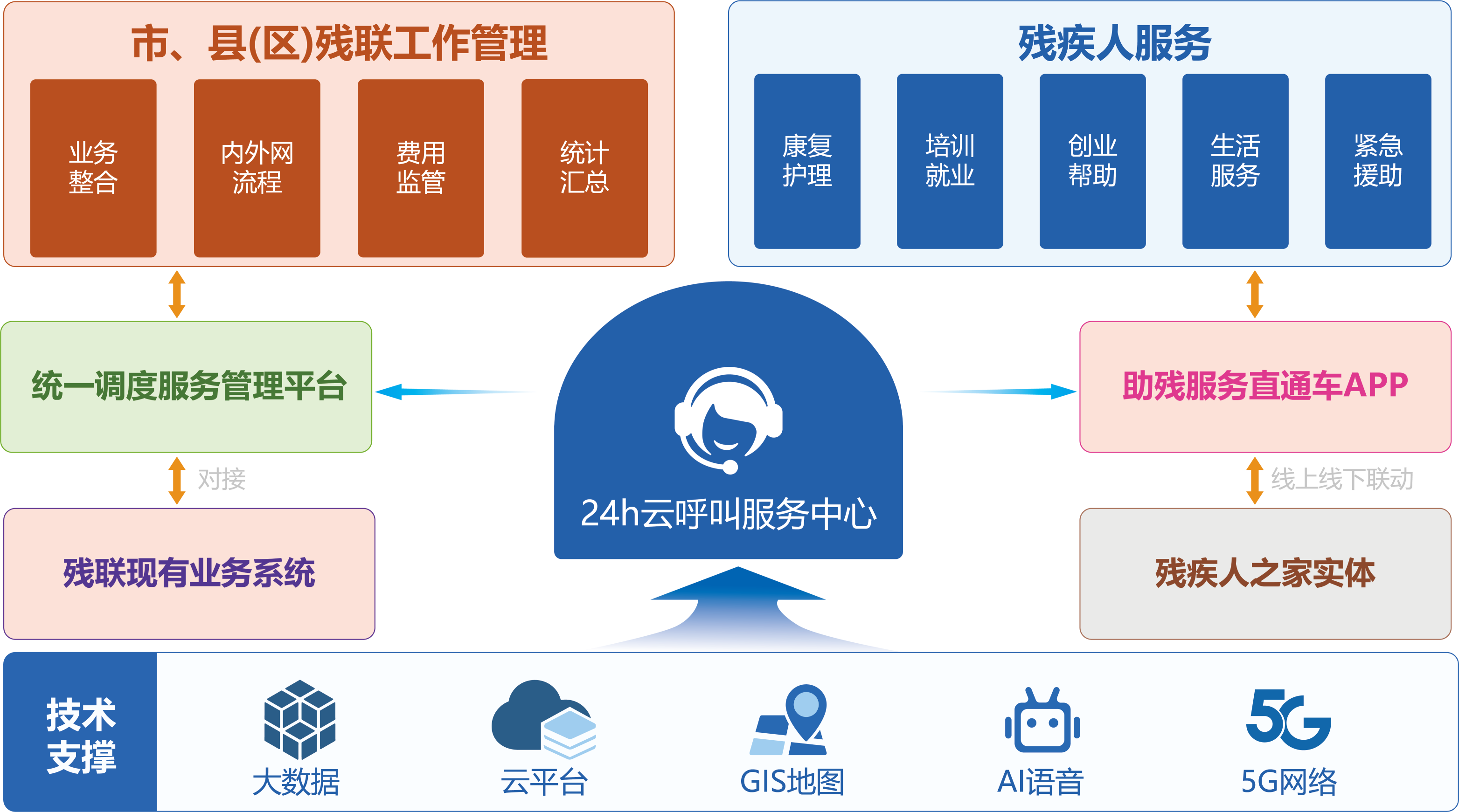 一方面,為殘疾人提供智慧助殘服務(wù)。通過助殘統(tǒng)一平臺(tái)整合社會(huì)醫(yī)養(yǎng)機(jī)構(gòu)和服務(wù)企業(yè),集成助殘智能產(chǎn)品,組建運(yùn)營(yíng)管理團(tuán)隊(duì),構(gòu)建一殘聯(lián)統(tǒng)一服務(wù)監(jiān)管平臺(tái)、一24小時(shí)呼叫服務(wù)中心、一助殘服務(wù)直通車APP、一殘疾人大數(shù)據(jù)庫(kù)、一殘疾人之家的“五維一體”智慧助殘架構(gòu),為殘疾人提供24小時(shí)在線受理生活幫助和緊急輔助救援、提供培訓(xùn)就業(yè)創(chuàng)業(yè)全鏈條平臺(tái),促進(jìn)殘疾人就業(yè)、殘疾人實(shí)體進(jìn)行業(yè)務(wù)對(duì)接與推介,促進(jìn)殘疾人增收。實(shí)行線上平臺(tái)與線下實(shí)體實(shí)時(shí)互動(dòng),人工服務(wù)與智能管理交互融合。創(chuàng)新立體式,全方位、多功能、全覆蓋的城市區(qū)域型生態(tài)助殘格局。